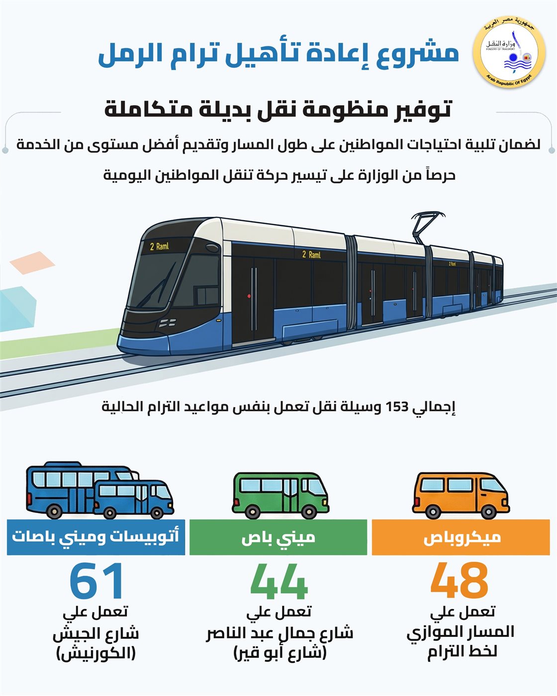 نشرت وزارة النقل عبر صفحتها الرسمية مجموعة من الإنفوجرافات التي توضح استمرار العمل في مشروع إعادة تأهيل ترام الرمل بمحافظة الإسكندرية، والذي يعد جزءاً من الرؤية الاستراتيجية للدولة لتطوير منظومة النقل الجماعي الأخضر والمستدام، بهدف تحسين الخدمات المقدمة للمواطنين والتقليل من مشكلات التكدس المروري في مدينة الإسكندرية.