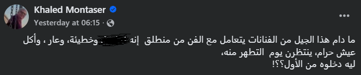 أعاد خالد منتصر نشر تصريحات شيماء سيف عبر حسابه الشخصي بموقع التواصل الإجتماعي الأشهر “فيسبوك”، وأرفقها بتعليق قائلًا: “ما دام هذا الجيل من الفنانات يتعامل مع الفن من منطلق إنه خطيئة، وعار ، وأكل عيش حرام، ينتظرن يوم التطهر منه، ليه دخلوه من الأول؟!”