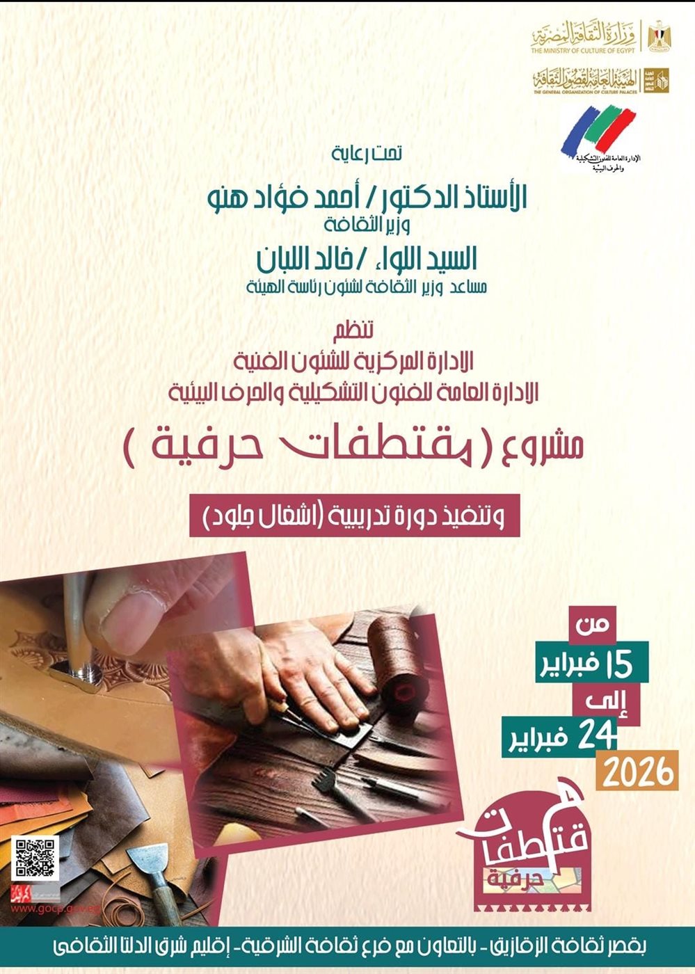 وتتضمن الفعاليات ورشة تدريبية لتعليم أشغال الجلود، تقدمها الفنانة أسماء طه، وتستمر حتى 24 فبراير الجاري، وذلك بالتعاون مع إقليم شرق الدلتا الثقافي برئاسة الكاتب أحمد سامي خاطر، وفرع ثقافة الشرقية.