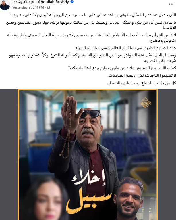 يرى رشدي أن هذه الوقائع تسيء لنا أمام "السياح" والعالم، والحقيقة أن ما يسيء لمصر فعلياً ليس تطبيق القانون وملاحقة المنحرفين، بل هو وجود خطاب يحاول الالتفاف على القانون بالتشكيك في الضحايا وتوفير بيئة خصبة "للمنطق التبريري" الذي يجعل من الرجل دائماً ضحية "لمؤامرة نسائية" مزعومة.