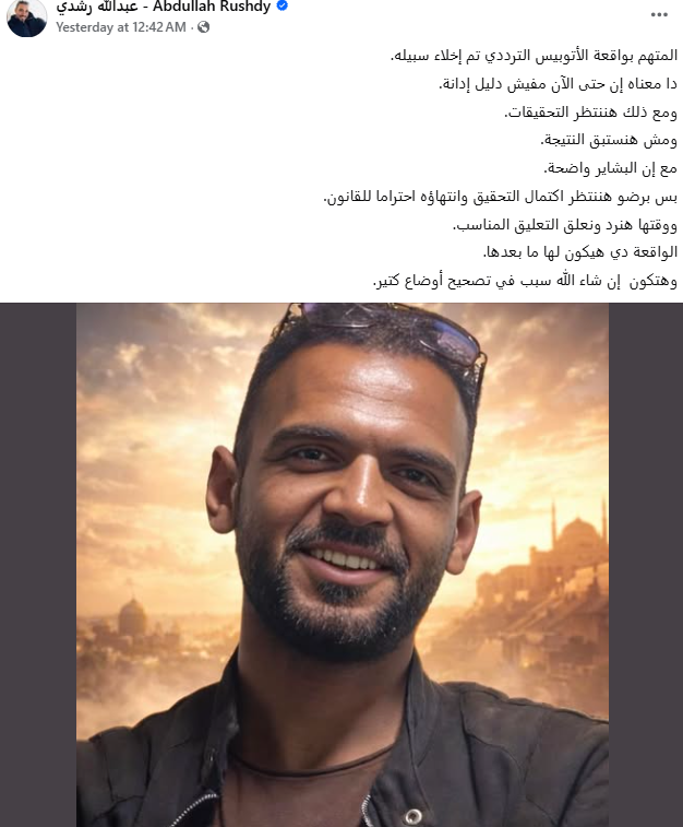 بدأ رشدي تدوينته بالاتكاء على إجراء قانوني معتاد، وهو "إخلاء سبيل المتهم"، معتبراً إياه "بشارة" براءة، وهنا يسقط "رجل الدين" في فخ التضليل القانوني؛ فإخلاء السبيل بضمان مالي أو محل إقامة هو إجراء احترازي لا يعني انتهاء القضية أو ثبوت البراءة، بل هو استكمال للتحقيقات، لكن رشدي، وفي تناقض صارخ، قال: "لن نستبق النتيجة"، ثم استبقها فوراً بوصف الواقعة بأنها "رمي بلا" و"تشويه لصورة الرجل المصري".