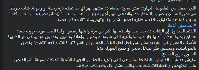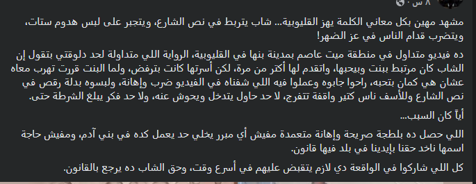 شهدت مواقع التواصل الاجتماعي خلال الساعات الماضية حالة من الغضب والاستياء الواسع، بعد تداول مقطع فيديو يُظهر مجموعة من الشباب وهم يعتدون على شاب آخر في أحد الشوارع العامة بمدينة بنها، ويجبرونه على ارتداء بدلة رقص قبل الاعتداء عليه بالضرب وسط تجمهر عدد من الأشخاص.