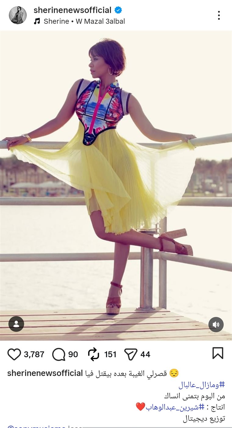 حيث نشرت شيرين صورة لها على حسابها الرسمي انستجرام مصحوبة بكلمات من أغنيتها الشهيرة «عسل حياتي»، وعلقت عليها بعبارة مقتبسة من الأغنية: «قصرلي الغيبة بعده بيقتل فيا».