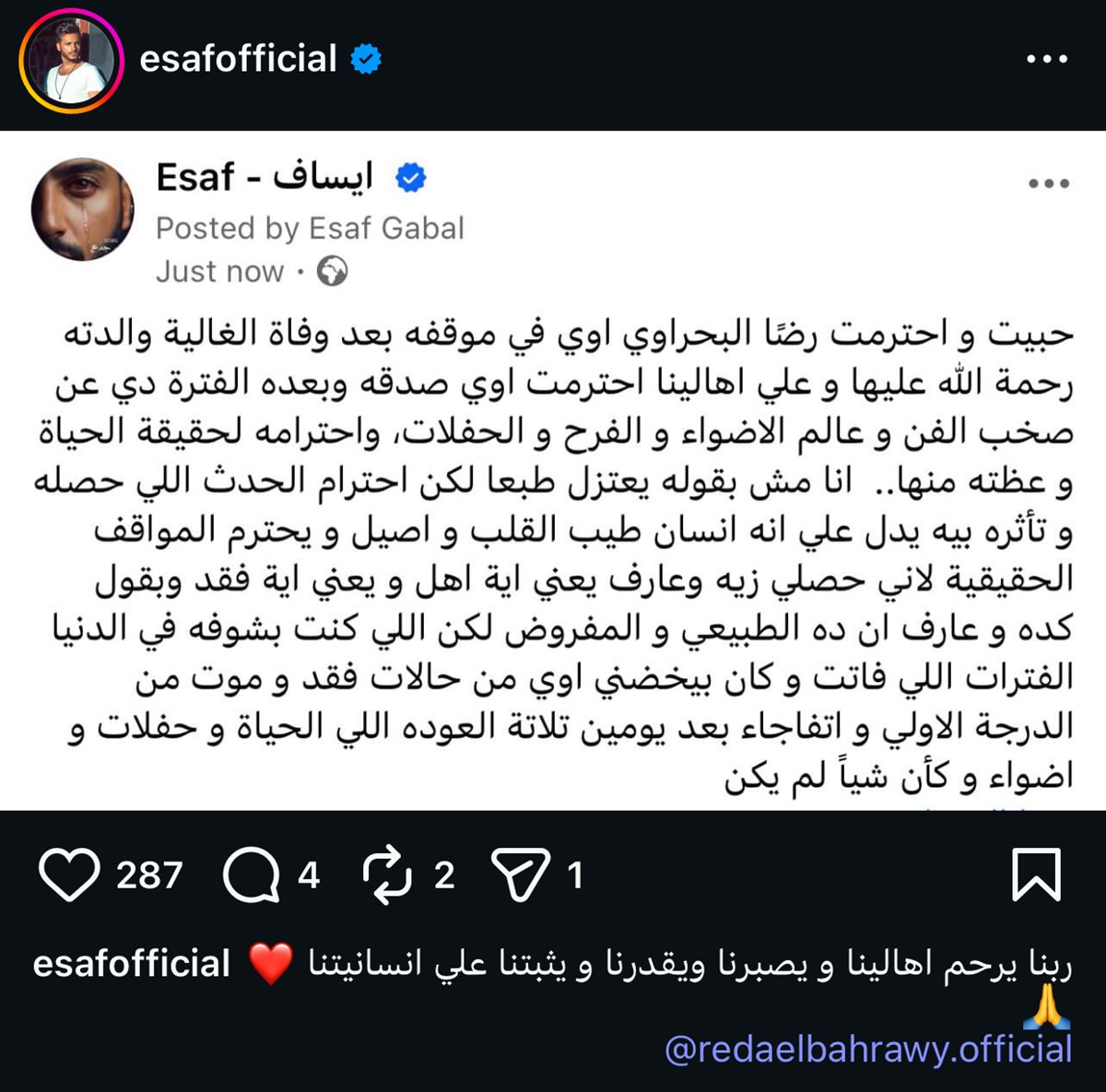 أوضح إيساف تقديره لرضا البحراوي، في تعليق له عبر صفحاته الرسمية على مواقع التواصل الاجتماعي، مشيدًا بصدقه وتأثره بالظروف الإنسانية التي مر بها، واعتبر موقفه نموذجًا للوفاء والاحترام، قائلا: "حبيت و احترمت رضًا البحراوي اوي في موقفه بعد وفاة الغالية والدته رحمة الله عليها و علي اهالينا احترمت اوي صدقه وبعده الفترة دي عن صخب الفن و عالم الاضواء و الفرح و الحفلات، واحترامه لحقيقة الحياة و عظته منها".