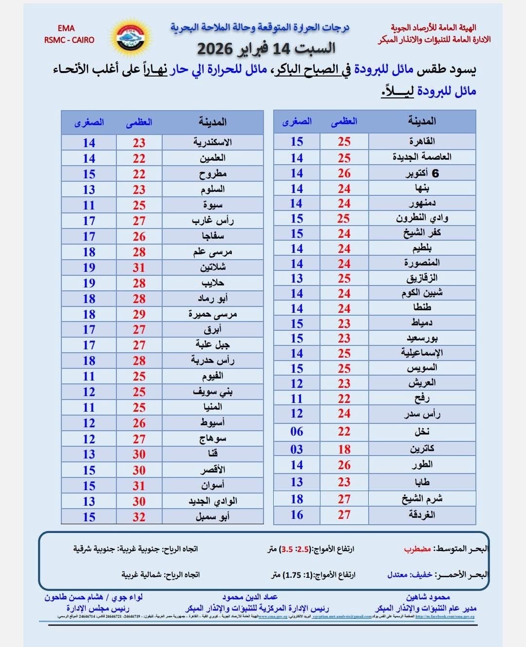 يشهد اليوم السبت الموافق 14 فبراير، طقس مائل للبرودة صباحا وليلا ومائل للحرارة نهارا على أغلب الأنحاء، يصاحبه أتربة عالقة على مناطق من شمال البلاد حتى شمال الصعيد ووسط سيناء والمناطق المكشوفة من القاهرة الكبرى.