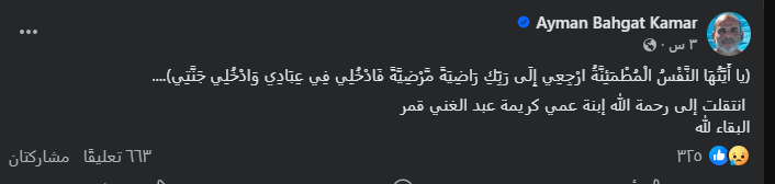 وكتب أيمن بهجت قمر، عبر حسابه على فيسبوك: "(يا أَيَّتُهَا النَّفْسُ الْمُطْمَئِنَّةُ ارْجِعِي إِلَى رَبِّكِ رَاضِيَةً مَّرْضِيَّةً فَادْخُلِي فِي عِبَادِي وَادْخُلِي جَنَّتِي).. انتقلت إلى رحمة الله ابنة عمي كريمة عبد الغني قمر.. البقاء لله".