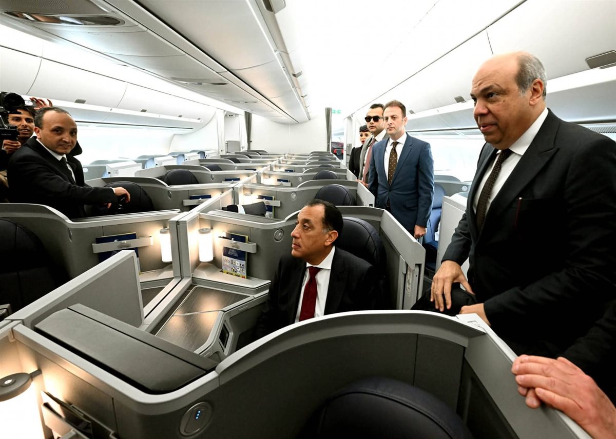 خلال فعاليات الاحتفال بانضمام أول طائرة من طراز Airbus A350-900 إلى أسطول الناقل الوطني، تفقد الدكتور مصطفى مدبولي، رئيس مجلس الوزراء، ومرافقوه، الطائرة الجديدة منAirbus ، التى تأتي ضمن صفقة أبرمتها شركة "مصر للطيران" مع شركة "Airbus" لضم 16 طائرة من طراز A350-900 للأسطول الوطني.