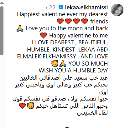 وتابعت:"I LOVE DEAREST , BEAUTIFUL, HUMBLE, KINDEST LEKAA ABD ELMALEK ELKHAMISSY , AND LOVE YOU SO MUCH 🙏🥰 WISH YOU A HUMBLE DAY ".