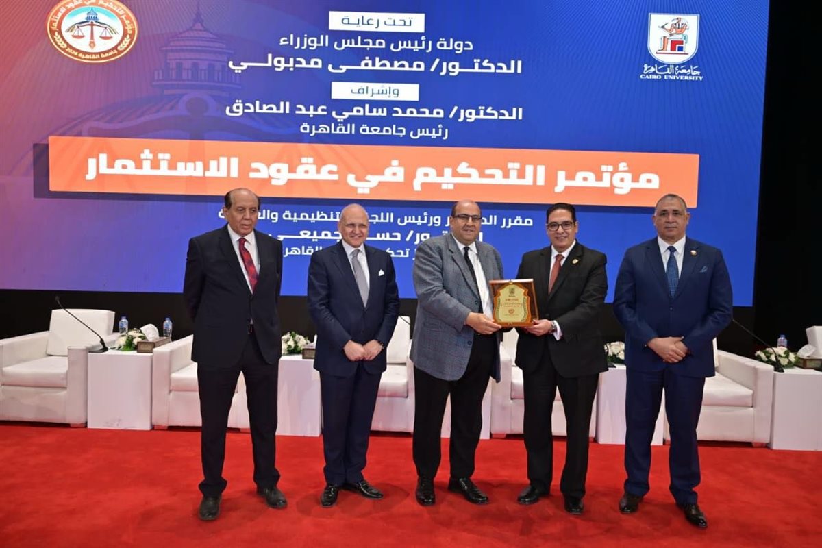 وكرم الدكتور محمد سامي عبدالصادق، خلال فعاليات الجلسة الافتتاحية للمؤتمر، الدكتور عبد الحليم علام، نقيب المحامين، والدكتور محمد سامح عمرو أستاذ القانون الدولي وعميد كلية الحقوق، والدكتور حسن جميعي مدير مركز التحكيم بجامعة القاهرة مقرر المؤتمر.