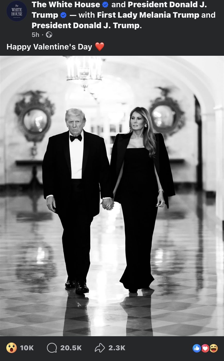نشرت الصفحة الرسمية للبيت الأبيض صورة الرئيس الأمريكي دونالد ترامب مع زوجته ميلانيا ترامب، بالأبيض والأسود، بمناسبة عيد الحب، وذلك على موقع التواصل الإجتماعي الأشهر “فيسبوك”.