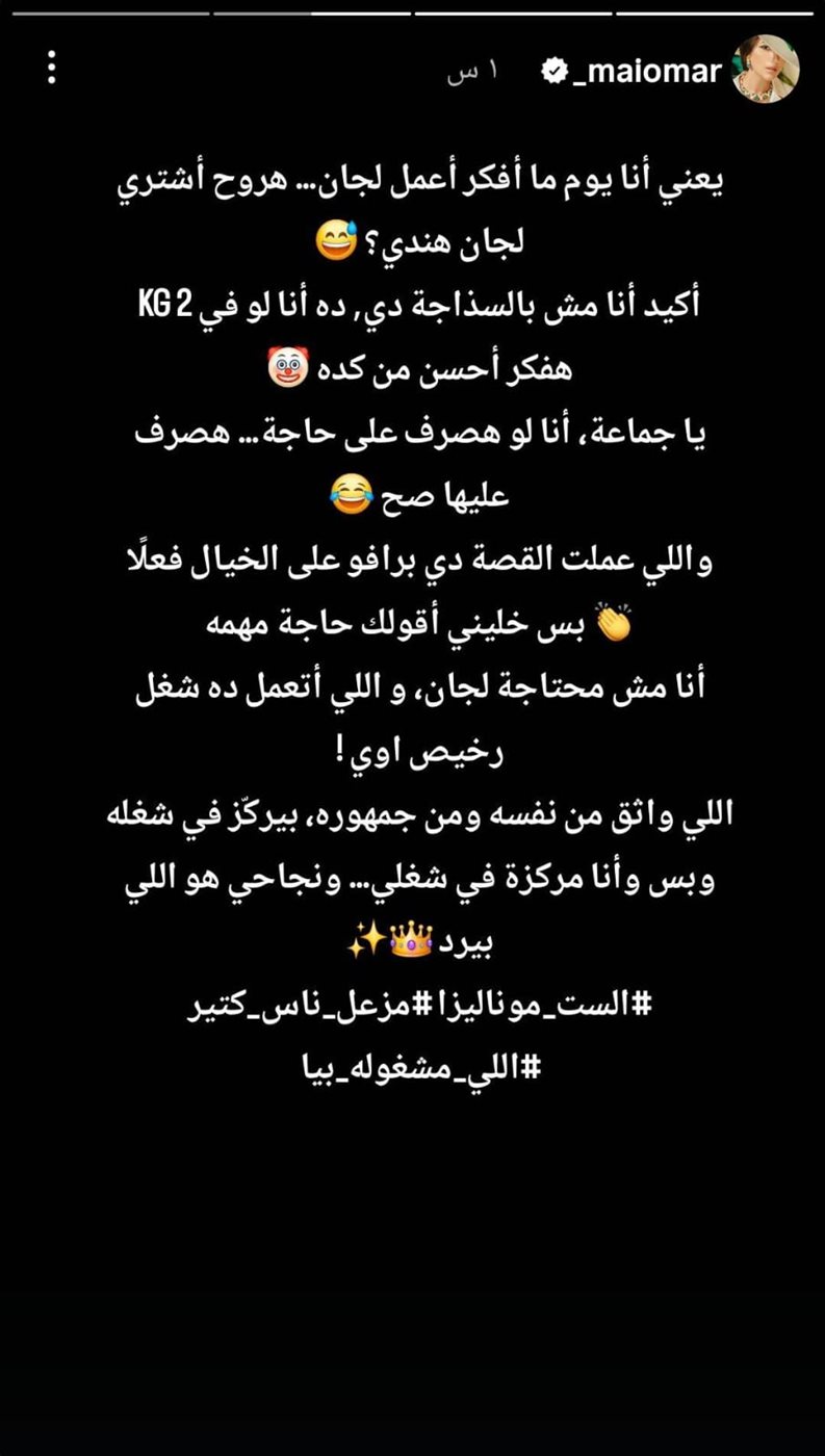 أوضحت مي  في رسالتها قائلة: “يعني أنا يوم ما أفكر أعمل لجان هروح أشتري لجان هندي؟ واللي عمل القصة دي برافو على الخيال فعلًا، بس خليني أقولك أنا مش محتاجة لجان، واللي اتعمل ده شغل رخيص، واللي واثق من نفسه ومن جمهوره بيركز في شغله ونجاحي هو اللي بيرد، الست موناليزا مزعل ناس كتير”.