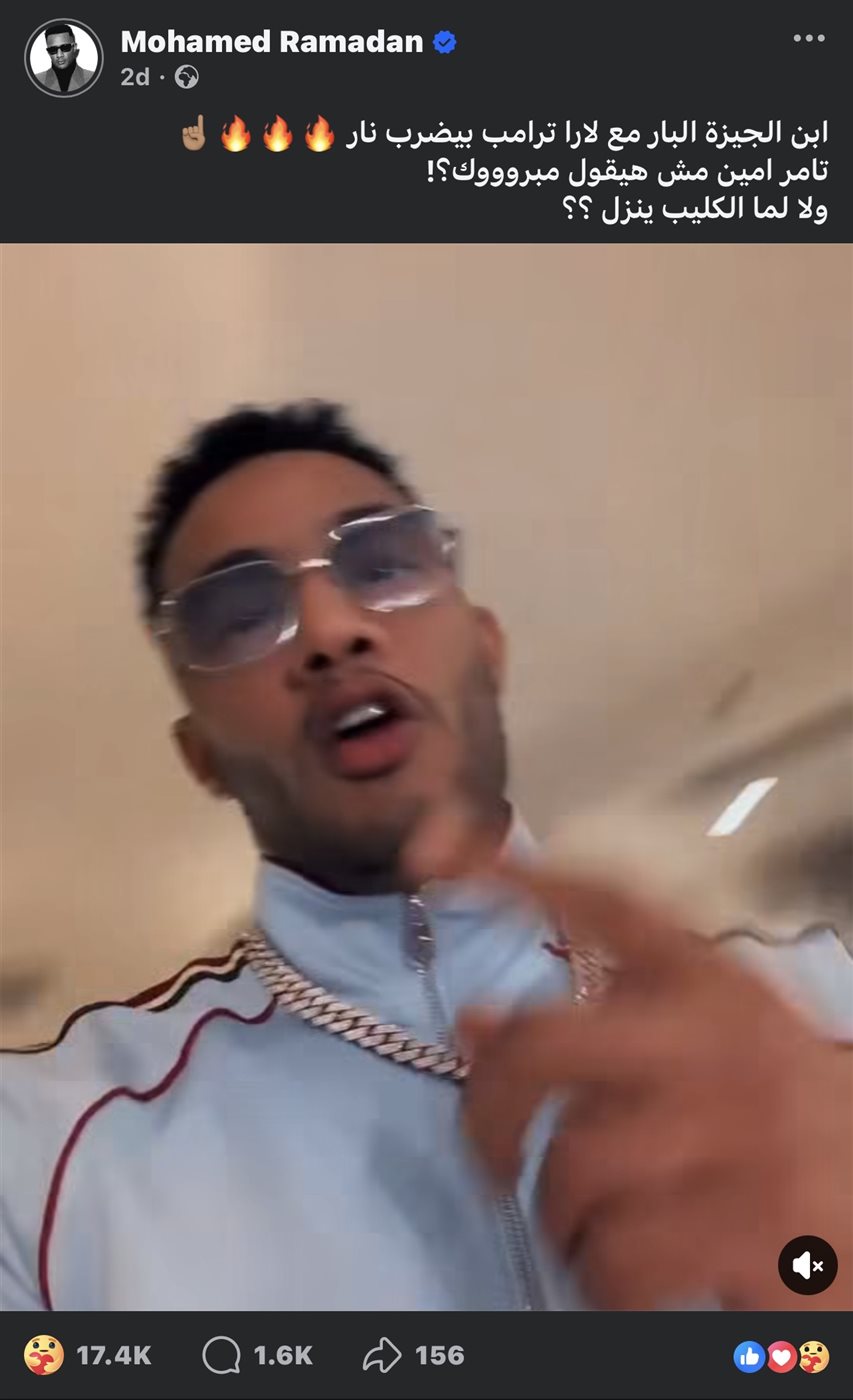 من جانبه، استغل محمد رمضان نجاح أغنيته مع لارا ترامب وقرر يوجّه رسالة لوم بأسلوب طريف، من خلال منشور عبر حسابه الشخصي بموقع التواصل الإجتماعي الأشهر “فيسبوك”.