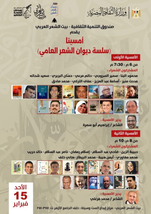 يقدّم مركز إبداع بيت الشعر العربي (بيت الست وسيلة) خلف الجامع الأزهر، التابع لقطاع صندوق التنمية الثقافية، اليوم الأحد الموافق 15 فبراير 2026، أمسية شعرية جديدة يستضيف من خلالها بعض شعراء سلسلة (ديوان الشعر العامي) التي تصدر عن الهيئة المصرية العامة للكتاب، وذلك في إطار برنامجه الهادف إلى دعم شعر العامية وإتاحة منابر منتظمة للتجارب الشعرية المعاصرة.