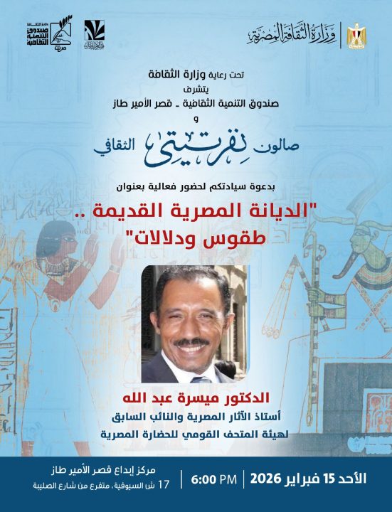 يقيم مركز إبداع قصر الأمير طاز بالسيوفية التابع لصندوق التنمية الثقافية، بالتعاون مع صالون نفرتيتي الثقافي، اليوم الأحد الموافق 15 فبراير 2026، حلقة جديدة بعنوان “الديانة المصرية القديمة.. طقوس ودلالات”، وذلك في تمام السادسة مساءً.
