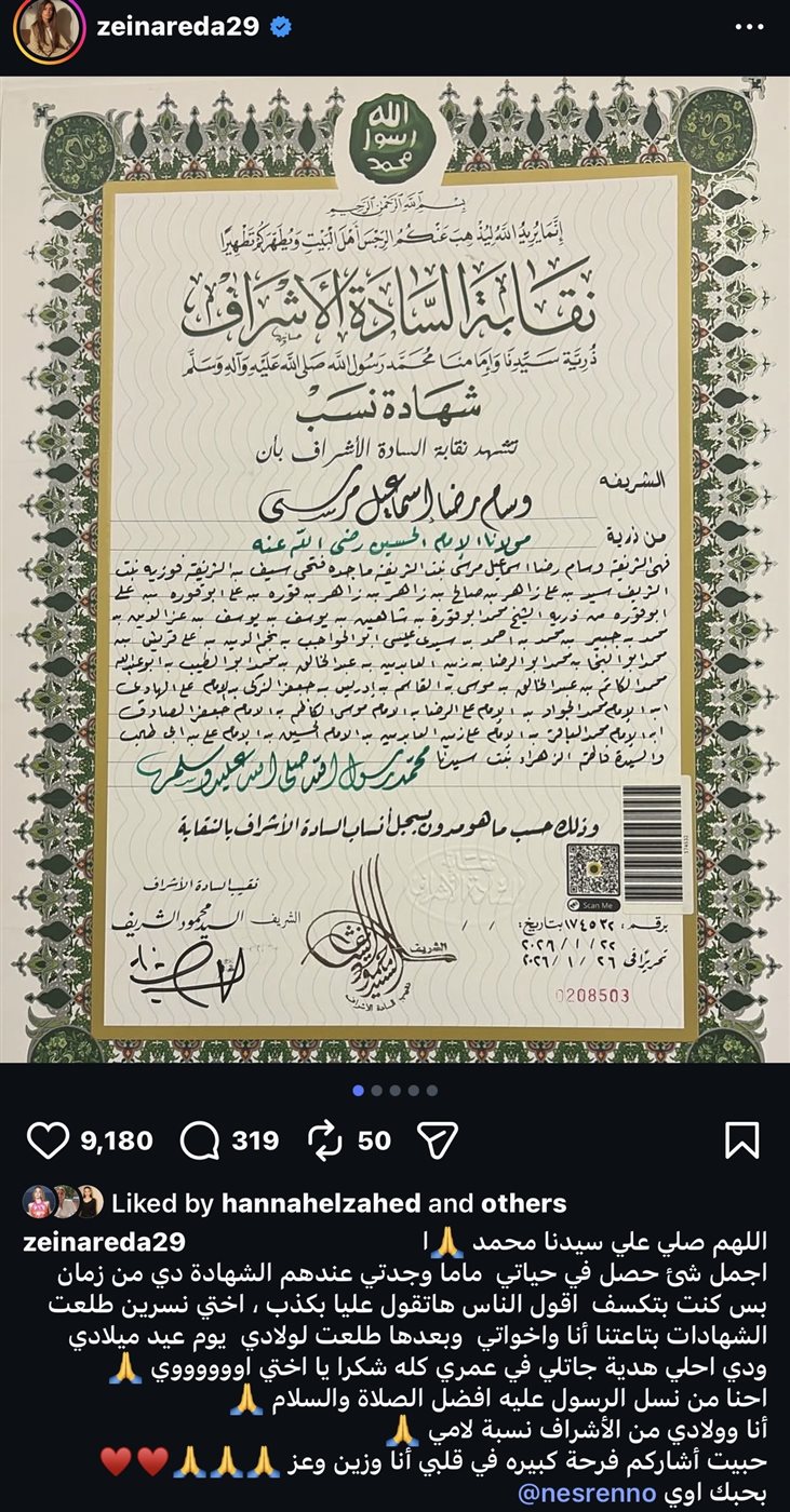 كما شاركت زينة عبر حسابها الرسمي على موقع إنستجرام صورًا من الشهادات التي تُثبت نسبها إلى الرسول صلى الله عليه وسلم، وعلّقت قائلة:“اللهم صلي على سيدنا محمد.. أجمل شيء حصل في حياتي، ماما وجدتي عندهم الشهادة دي من زمان، بس كنت بتكسف أقول والناس هتقول عليا بكذب، أختي نسرين طلعت الشهادات بتاعتنا أنا وإخواتي، وبعدها طلعت لأولادي يوم عيد ميلادي، ودي أحلى هدية جاتلي في عمري كله.. شكرًا يا أختي أوي”.