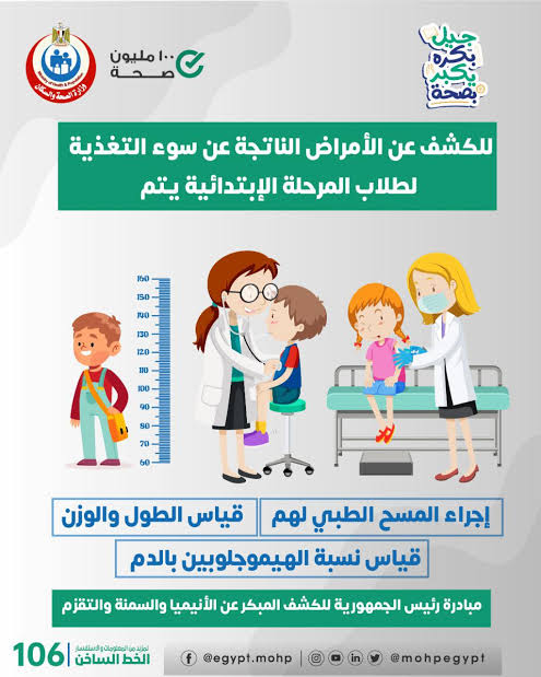 أعلنت وزارة الصحة والسكان استئناف العمل بمبادرة الرئيس عبدالفتاح السيسي للكشف المبكر عن أمراض الأنيميا والسمنة والتقزم لدى طلاب المرحلة الابتدائية، بالتزامن مع بدء الفصل الدراسي الثاني لهذا العام.