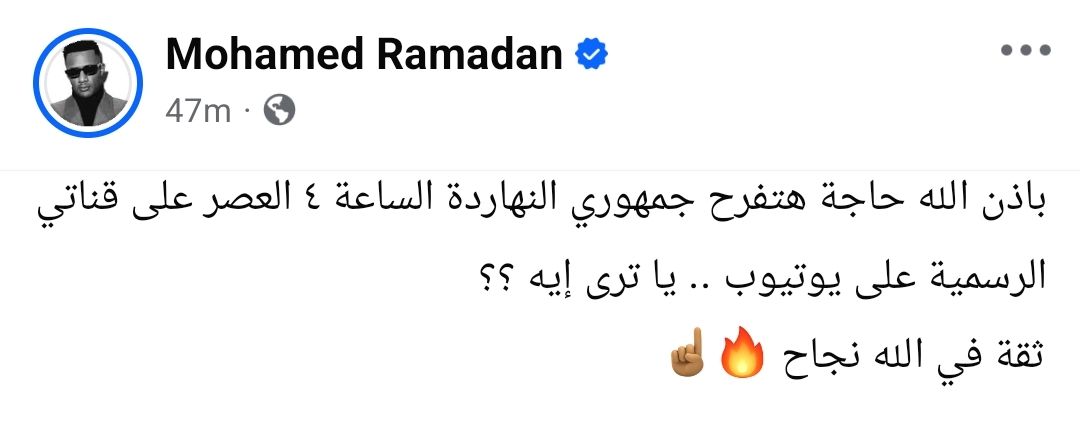 وكتب رمضان في منشوره: «بإذن الله حاجة هتفرح جمهوري النهاردة الساعة ٤ العصر على قناتي الرسمية على يوتيوب.. ثقة في الله نجاح».