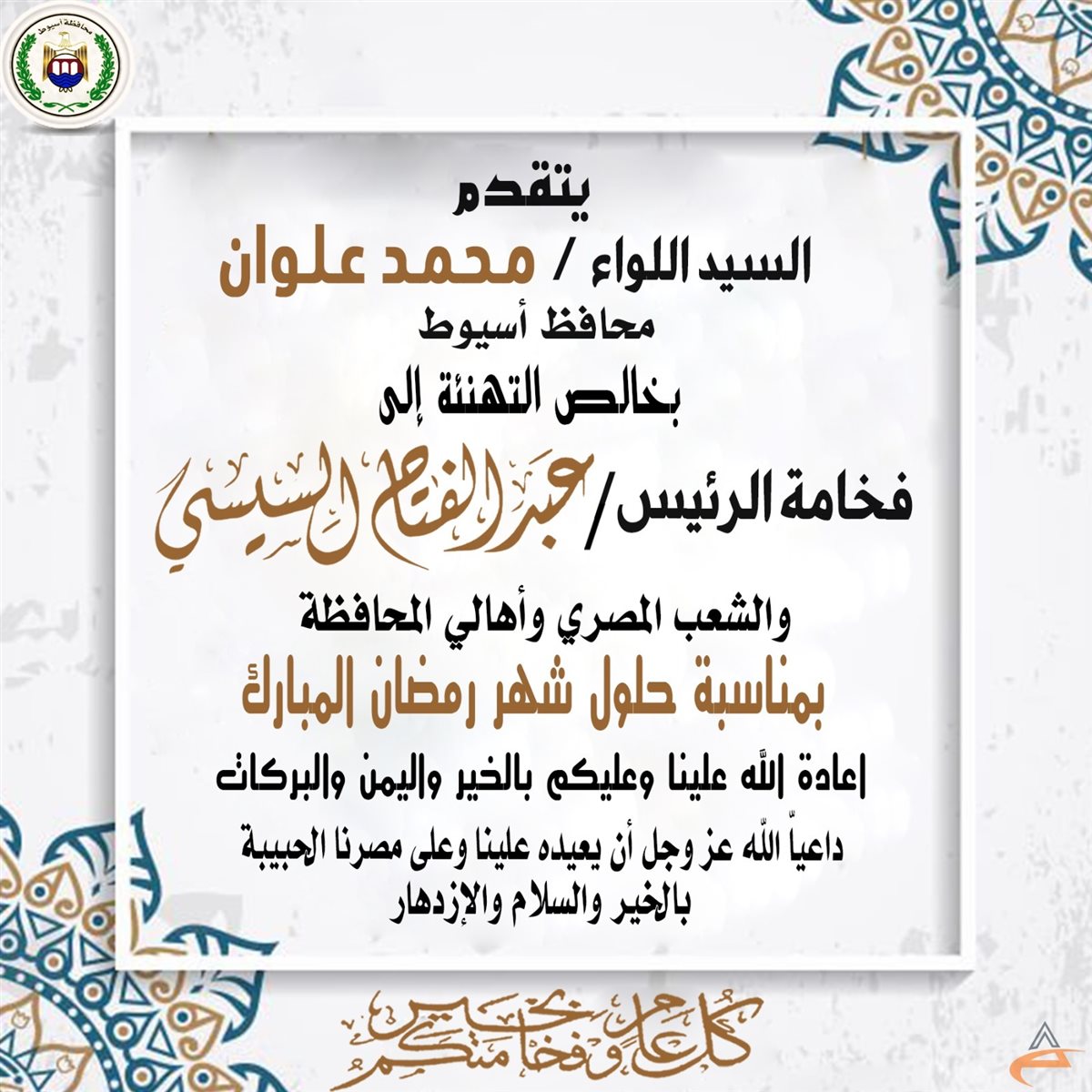 محافظ أسيوط يهنئ الرئيس السيسي بحلول شهر رمضان المبارك