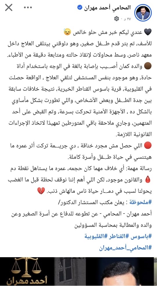 وأضاف: “والده كمان أصيب بإصابة بالغة في الوجه باستخدام أداة حادة، وهو موجود بنفس المستشفى لتلقي العلاج ، الواقعة حصلت في القليوبية، قرية باسوس القناطر الخيرية، نتيجة خلافات سابقة بين جدة الطفل وبعض الأشخاص، واللي تطورت بشكل مأساوي بالشكل ده”.