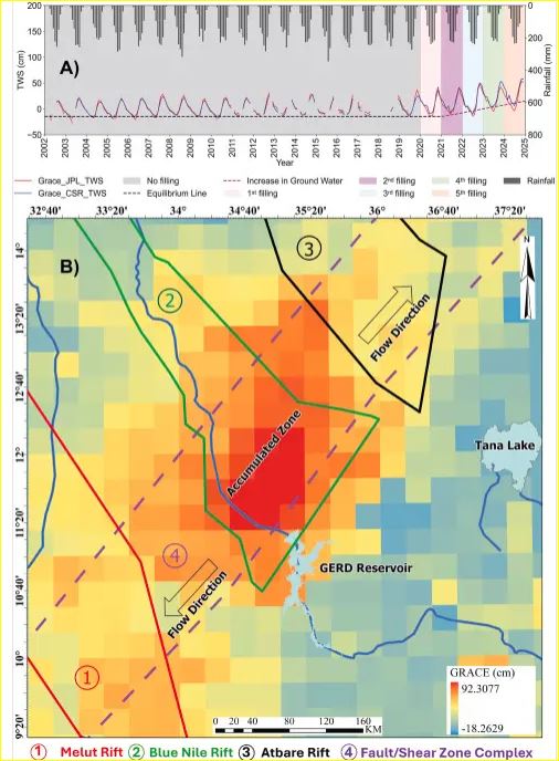 وبيّن أن الدراسة اعتمدت على تكامل واسع لبيانات رصد الأرض عبر خمسة محاور منهجية متقدمة لضمان دقة التحليل وشموليته، فقد تم تتبع التغيرات في مخزون المياه الجوفية خلال مراحل الملء الخمس للسد، بهدف تقييم التقلبات في التخزين الجوفي، إلى جانب تطبيق نماذج هيدرولوجية متطورة تعتمد على معادلة توازن المياه العامة لمقارنة كميات التدفق الداخلة إلى الخزان مع الخارجة منه، مع احتساب عوامل الفقد مثل التبخر والترشيح.