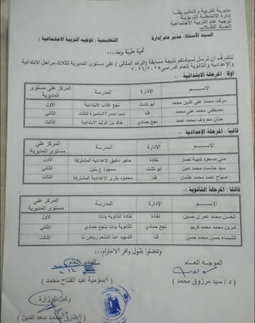 وكانت مديرية التربية والتعليم بقنا، قد أعلنت عن أسماء الفائزين في مسابقة (الرائد المثالي ) على مستوى المديرية للمراحل التعليمية الإبتدائية، والإعدادية، والثانوية فى المسابقة التي أعدها ونظمها توجيه عام التربية الاجتماعية، تحت رعاية طارق سعد الدين وكيل وزارة التربية والتعليم بقنا، وإشراف سوميه عبد الفتاح مدير عام الشئون التنفيذية، وتنفيذ الدكتور سيد مرزوق موجه عام التربية الاجتماعية للعام الدراسي 2025-2026 .