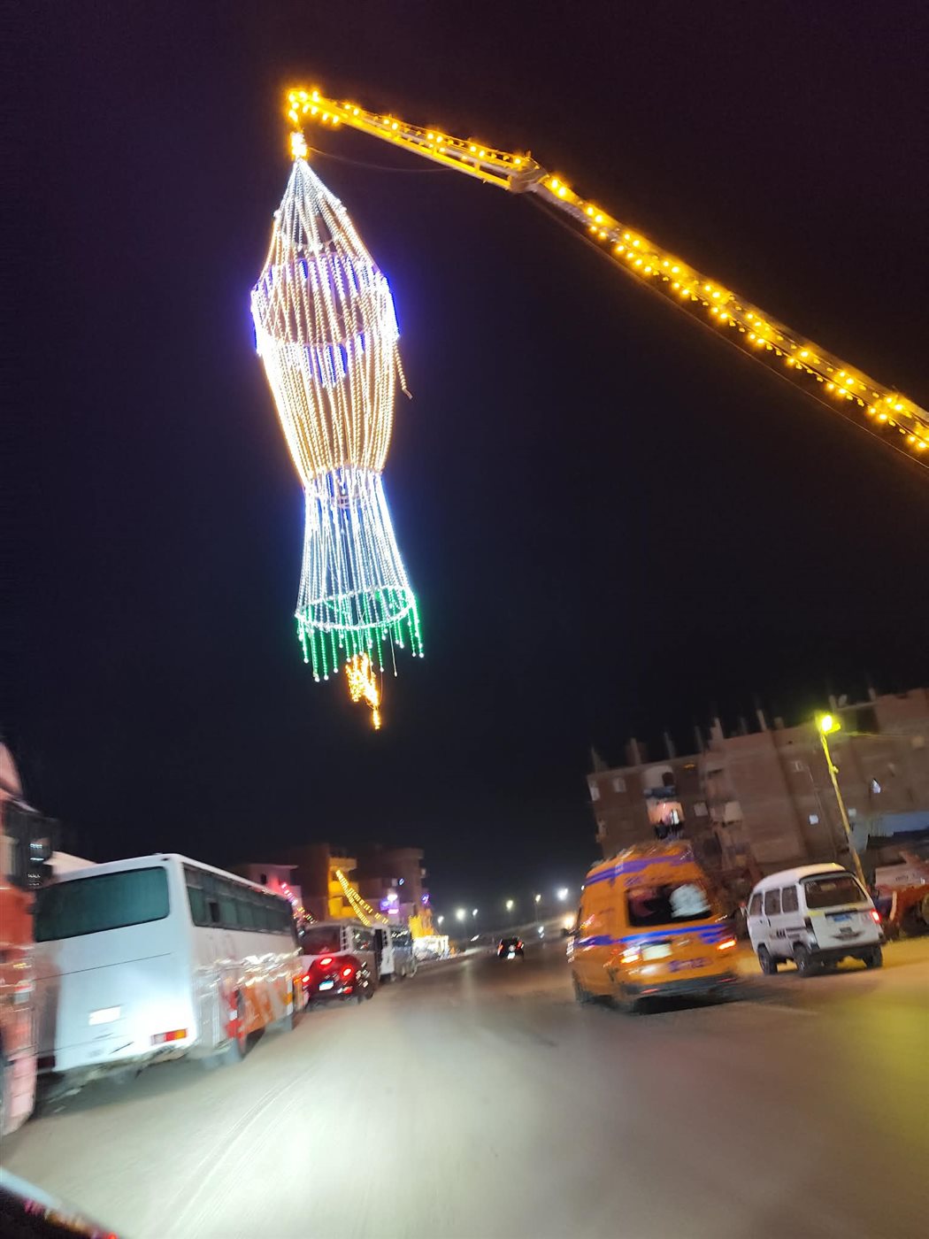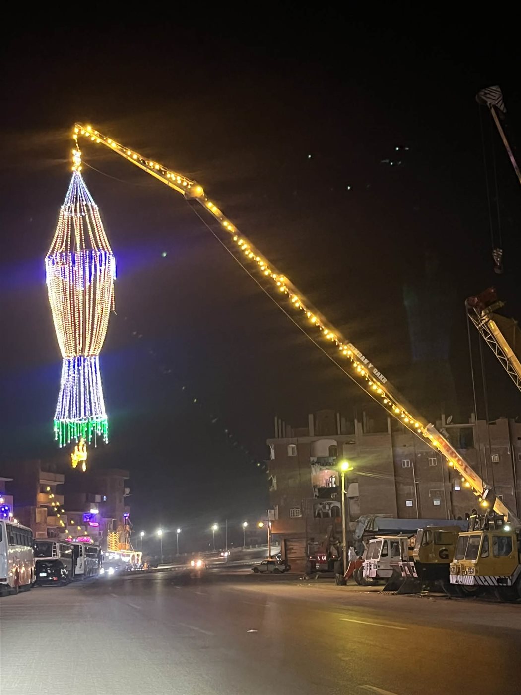 فانوس ضخم طوله ٥ ادوار على رافعة ونش يزيين مدخل مدينة الإسماعيلية
