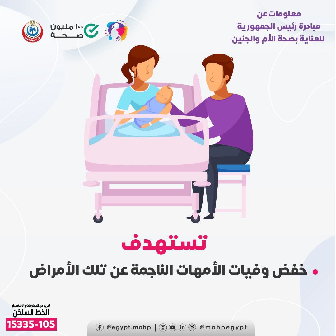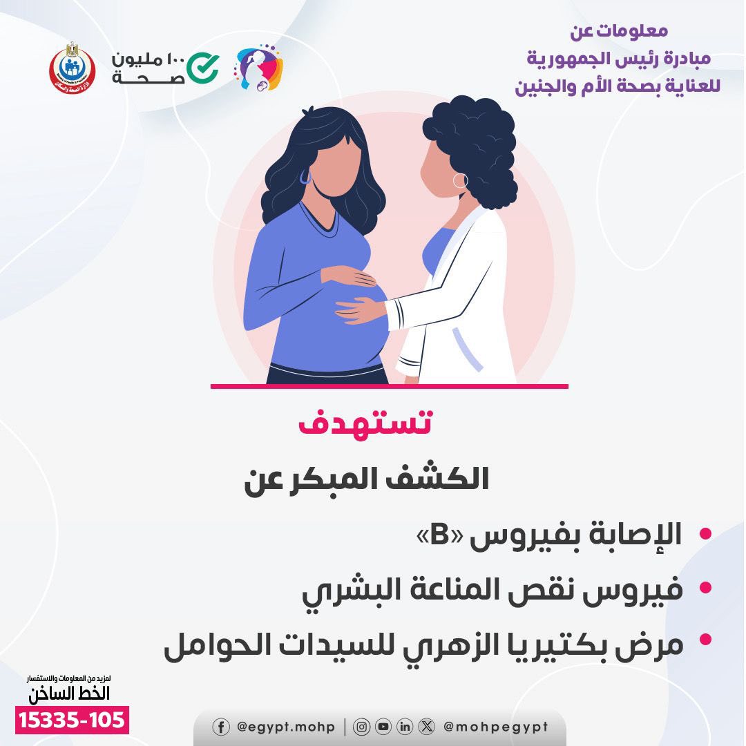 وأوضح الدكتور حسام عبدالغفار المتحدث الرسمي للوزارة أن المبادرة تركز على الكشف المبكر عن الأمراض المنقولة من الأم إلى الجنين، وتوفير العلاج الفوري والرعاية الكاملة مجانًا، مع التركيز الرئيسي على الكشف عن فيروس الكبد الوبائي «ب»، وفيروس نقص المناعة البشرية، ومرض الزهري لدى السيدات الحوامل، لضمان ولادة آمنة وطفل سليم.