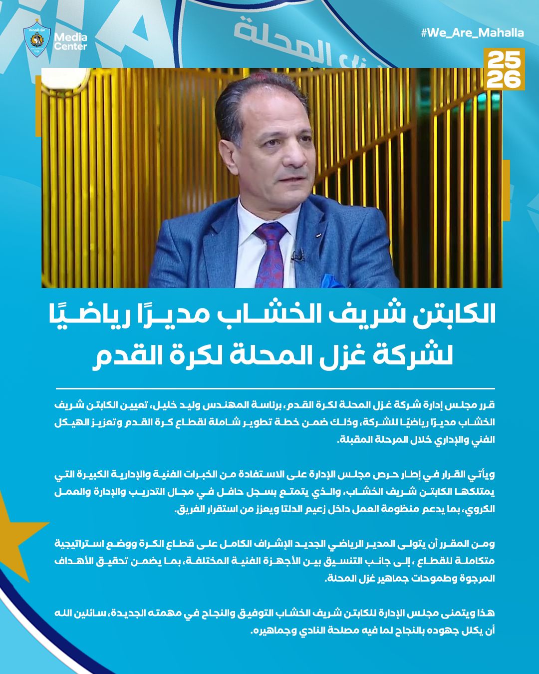 قرر مجلس إدارة شركة غزل المحلة لكرة القدم، برئاسة المهندس وليد خليل، تعيين الكابتن شريف الخشاب مديرًا رياضيًا للشركة، وذلك ضمن خطة تطوير شاملة لقطاع كرة القدم وتعزيز الهيكل الفني والإداري خلال المرحلة المقبلة.
