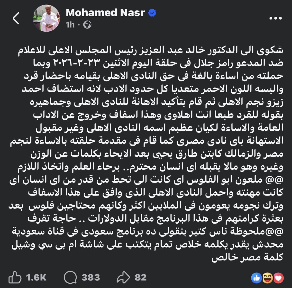 قال محمد نصر: “شكوى الى الدكتور خالد عبد العزيز رئيس المجلس الاعلى للاعلام ضد المدعو رامز جلال فى حلقة اليوم الاثنين ٢٣-٢-٢٠٢٦ وبما حملته من اساءة بالغة فى حق النادى الاهلى بقيامه باحضار قرد والبسه اللون الاحمر متعديا كل حدود الادب”.