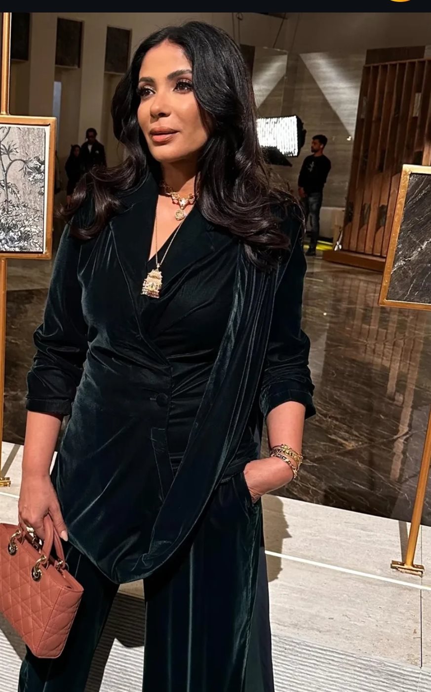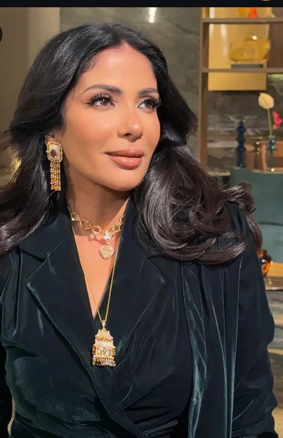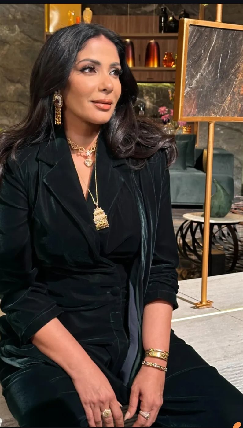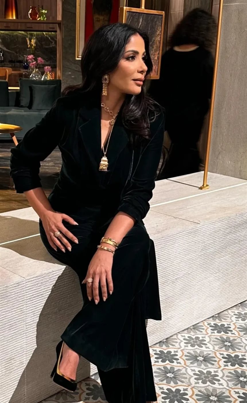 وبدت مني زكي بإطلالة جذابة، حيث ارتدت بدله صممت من قماش المخمل باللون الأخضر الغامق لتواكب موضة خريف وشتاء 2025.2026، وتزينت ببعض المجوهرات الذهبية.