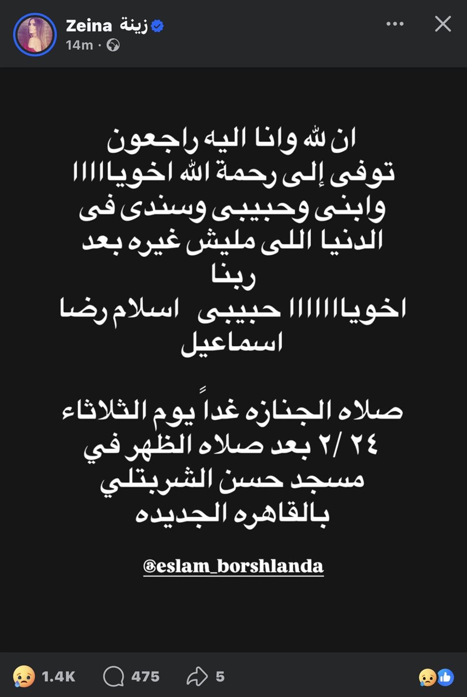 قالت زينة: “إنا الله وانا اليه راجعون توفى إلى رحمة الله اخويااااا وابني وحبيبي وسندي في الدنيا اللي مليش غيره بعد ربنا”.