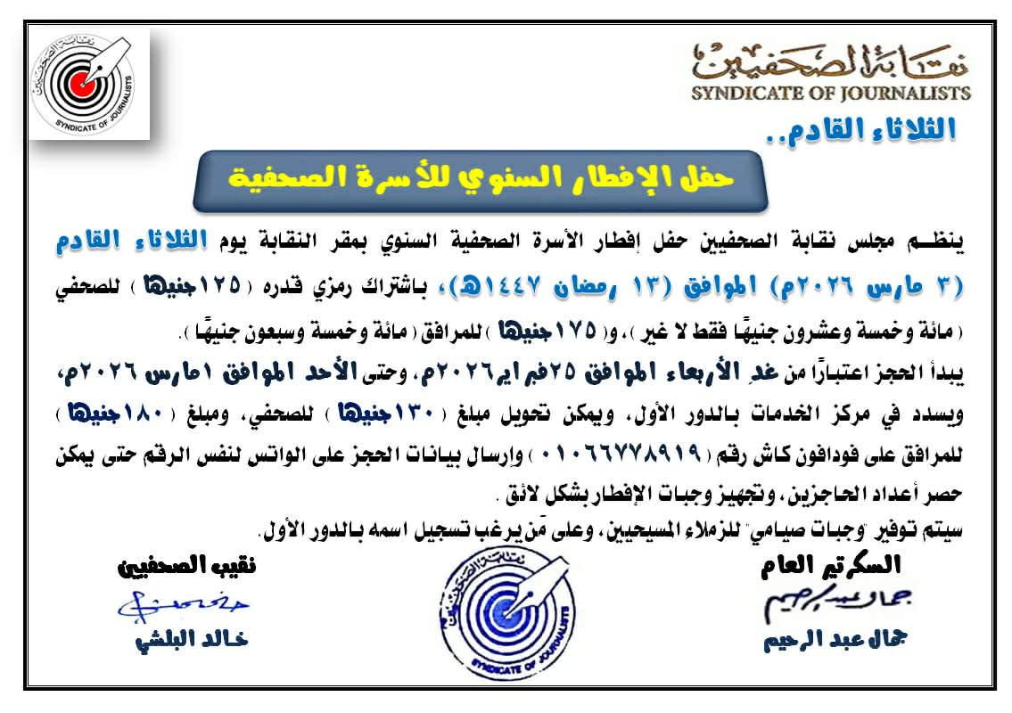 ينظم مجلس نقابة الصحفيين حفل إفطار الأسرة الصحفية السنوي بمقر النقابة يوم الثلاثاء القادم (3 مارس 2026م) الموافق (13 رمضان 1447هـ)، باشتراك رمزي قدره (125جنيهًا) للصحفي فقط لا غير، و(175جنيهًا) للمرافق.