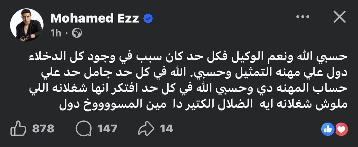 قال محمد عز: “حسبي الله ونعم الوكيل فكل حد كان سبب في وجود كل الدخلاء دول علي مهنه التمثيل وحسبي الله في كل حد جامل حد علي حساب المهنه دي”.