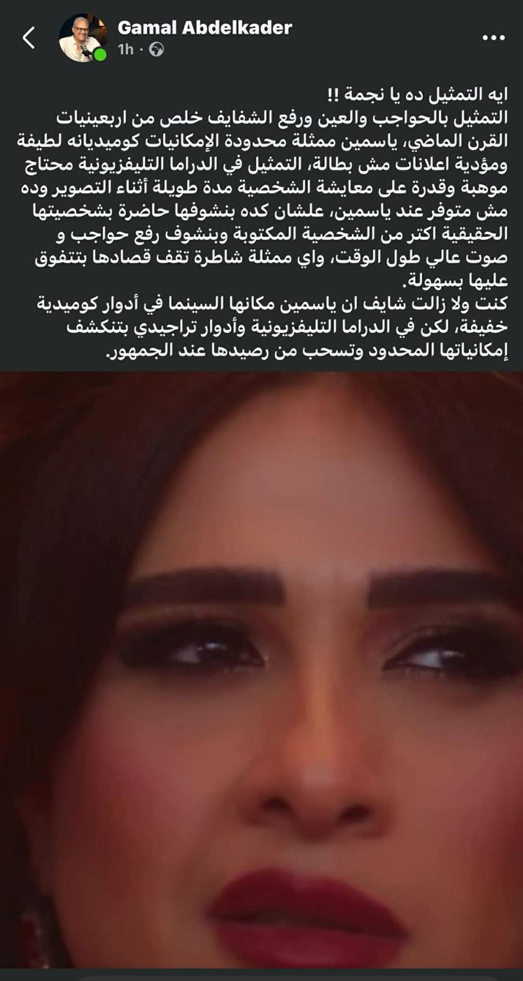واختتم قائلًا: “كنت ولا زالت شايف ان ياسمين مكانها السينما في أدوار كوميدية خفيفة، لكن في الدراما التليفزيونية وأدوار تراجيدي بتنكشف إمكانياتها المحدود وتسحب من رصيدها عند الجمهور”.