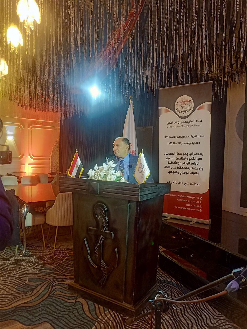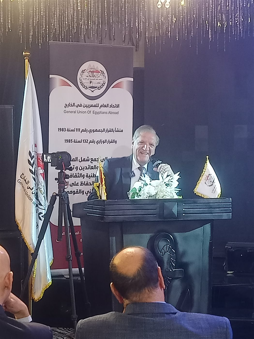 كما ألقى الأستاذ محمد أبو العيش، عضو الاتحاد العام للمصريين بالخارج، كلمة أكد خلالها أن الاتحاد يمثل بيتًا جامعًا لكل المصريين في الخارج، ويعمل على توحيد جهودهم لخدمة الوطن.