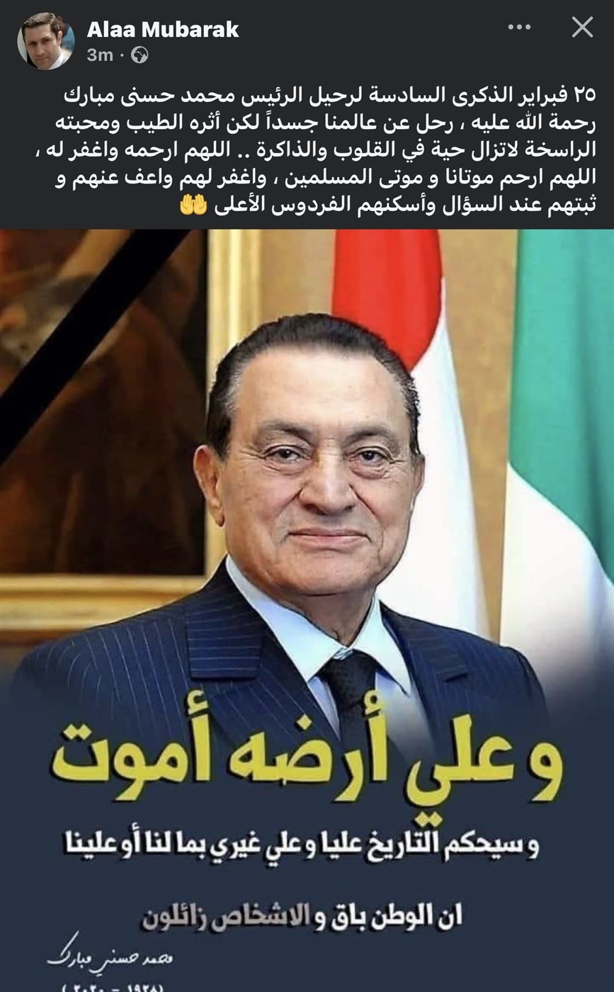 حرص علاء مبارك على إحياء الذكرى السادسة لوفاة والده الرئيس الراحل محمد حسني مبارك، والتي توافق ٢٥ فبراير ٢٠٢٠، وذلك خلال منشور عبر حسابه الشخصي بموقع التواصل الإجتماعي الأشهر “فيسبوك”.