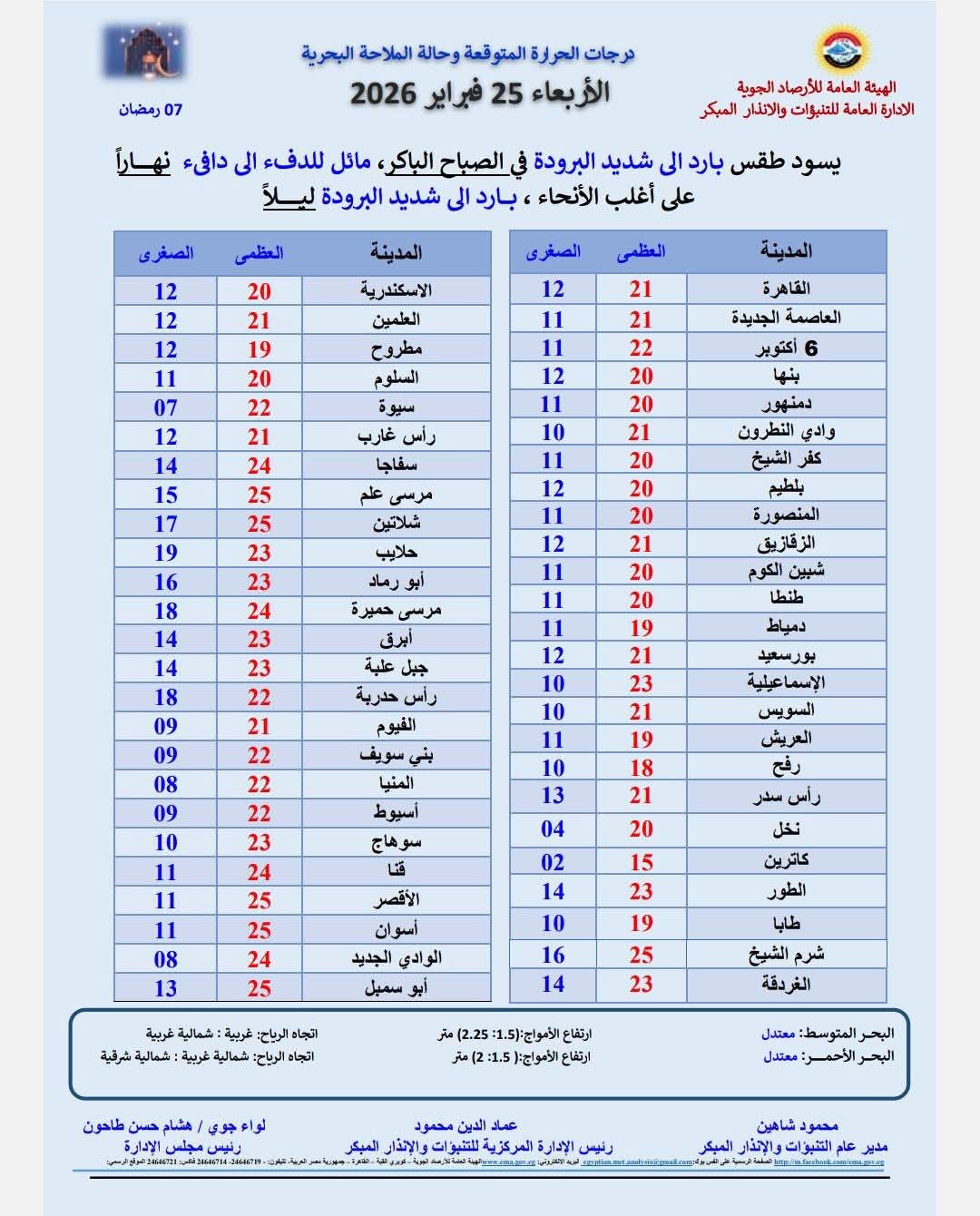 توقعت الهيئة العامة للأرصاد الجوية انخفاض في درجات الحرارة خلال الأيام المقبلة، فيما يسود اليوم الأربعاء الموافق السابع من رمضان و25 فبراير طقس بارد إلى شديد البرودة في الصباح الباكر والليل ومائل للدفء خلال النهار.