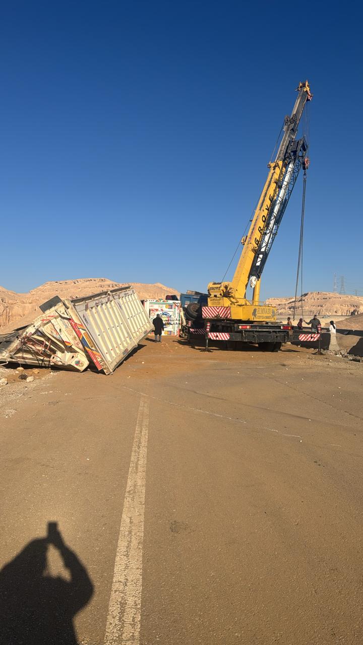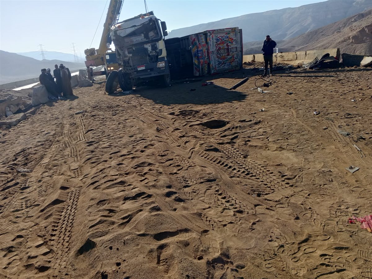 تسونامي النقل بصحراوي سوهاج.. "تريلا" مقلوبة تحبس أنفاس المسافرين على طريق الموت