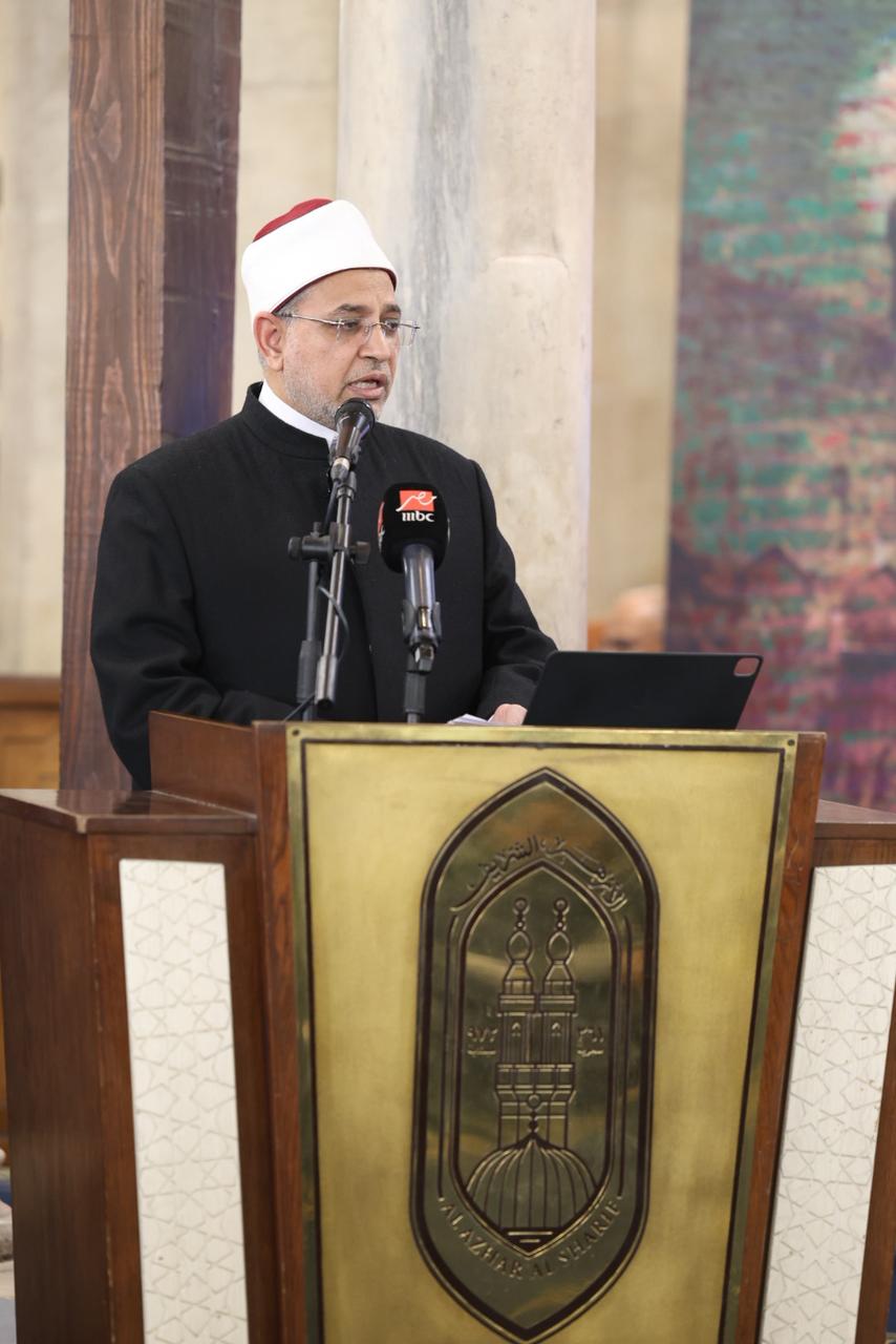 وأوضح خلال كلمته بالاحتفالية التي أقيمت بالجامع الأزهر عقب صلاة الظهر أن الأزهر ظل عبر تاريخه موطنًا للغُرِّ الميامين من رجاله الذين ترى فيهم الشافعي ومالكًا وأبا حنيفة وابن حنبل حضرًا في حلقاته وأروقته، مستشهدًا بقول أمير الشعراء أحمد شوقي عن الأزهر: «وَمَشى إِلى الحَلَقاتِ فَاِنفَجَرَت لَهُ * حَلقاً كَهالاتِ السَماءِ مُنَوِّرا.. حَتّى ظَنَنّا الشافِعِيَّ وَمالِكاً * وَأَبا حَنيفَةِ وَاِبنَ حَنبَلِ حُضَّرا.. إِنَّ الَّذي جَعَلَ العَتيقَ مَثابَةً * جَعَلَ الكِنانِيَّ المُبارَكَ كَوثَرا».