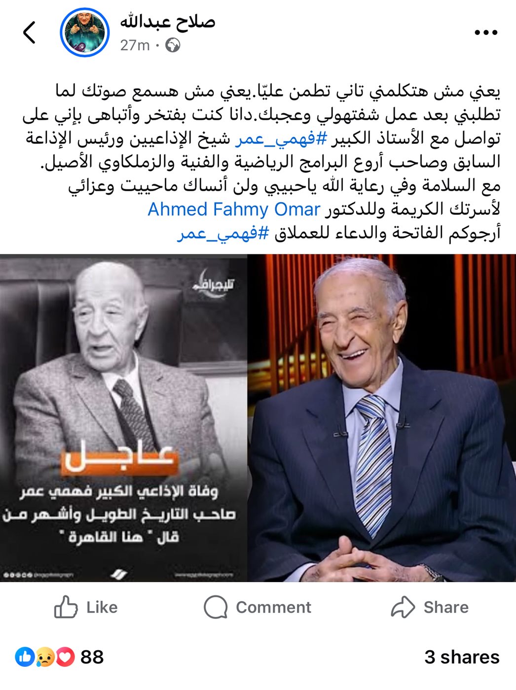 وقال عبر حسابه الشخصي على الموقع الأشهر فيسبوك: "يعني مش هتكلمني تاني تطمن عليّا. يعني مش هسمع صوتك لما تطلبني بعد عمل شفتهولي وعجبك.. دانا كنت بفتخر وأتباهى بإني على تواصل مع الأستاذ الكبير فهمي عمر شيخ الإذاعيين ورئيس الإذاعة السابق وصاحب أروع البرامج الرياضية والفنية والزملكاوي الأصيل.. مع السلامة وفي رعاية الله يا حبيبي ولن أنساك ما حييت، وعزائي لأسرتك الكريمة وللدكتور أحمد فهمي عمر.. أرجوكم الفاتحة والدعاء للعملاق".