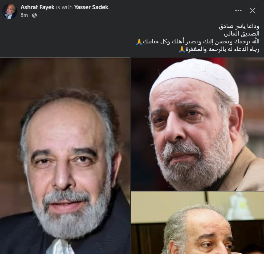 نشر أشرف فايق صور الراحل ياسر صادق وأرفقها بتعليق: “وداعًا ياسر صادق الصديق الغالي الله يرحمك ويحسن إليك ويصبر أهلك وكل حبايبك.. رجاء الدعاء له بالرحمة والمغفرة”.