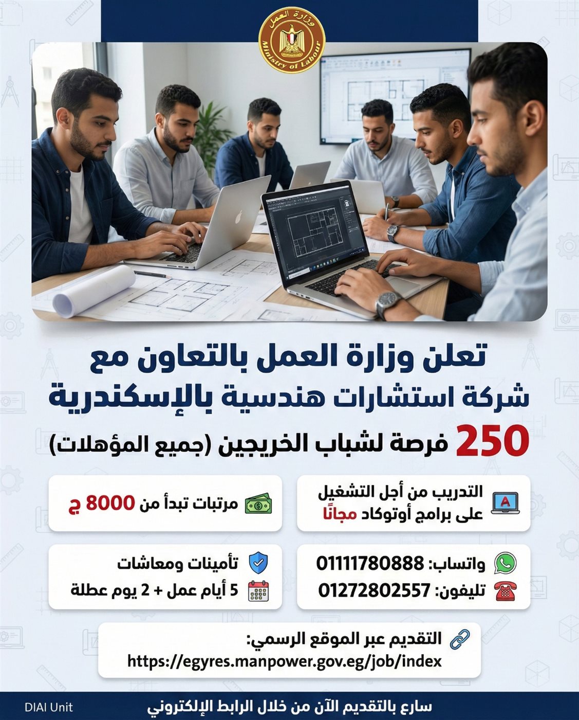 250 وظيفة بشركة هندسية في الإسكندرية.. أعلنت وزارة العمل، بالتعاون مع إحدى شركات الاستشارات الهندسية بمحافظة الإسكندرية، عن توفير 250 فرصة عمل لشباب الخريجين من جميع المؤهلات، وذلك في إطار جهود الدولة لدعم التشغيل وتوفير فرص عمل لائقة للشباب.