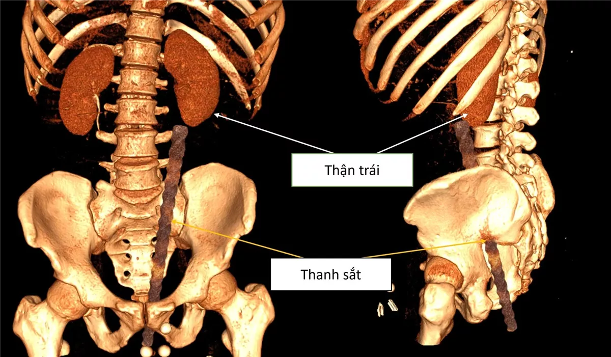 أظهر الفحص السريري والتصوير المقطعي المحوسب للبطن وجود دماء في القناة الشرجية والمثانة مع انتشار الهواء الحر والنزيف في تجويف البطن، واكتشف الفريق الجراحي أثناء العملية أن الجسم الغريب انتقل من منطقة الشرج ليصل إلى الضلع القطني الأيسر مسببا أضرارا بالغة في الحوض والفضاء خلف الصفاق، وتضمنت الإصابات كدمة في جدار المستقيم الأمامي بطول 3 سم وتلفا كاملا في الحالب الأيسر من جدار المثانة حتى حوض الكلية مع تمزق جدار الشريان الحرقفي الأيسر، وتسبب هذا التمزق الوعائي في تكون ورم دموي ضخم خلف الصفاق مما جعل حياة المريض في مهب الريح داخل مستشفى كام فا العام بمدنية كوانغ نينه التابعة لجمهورية فيتنام.