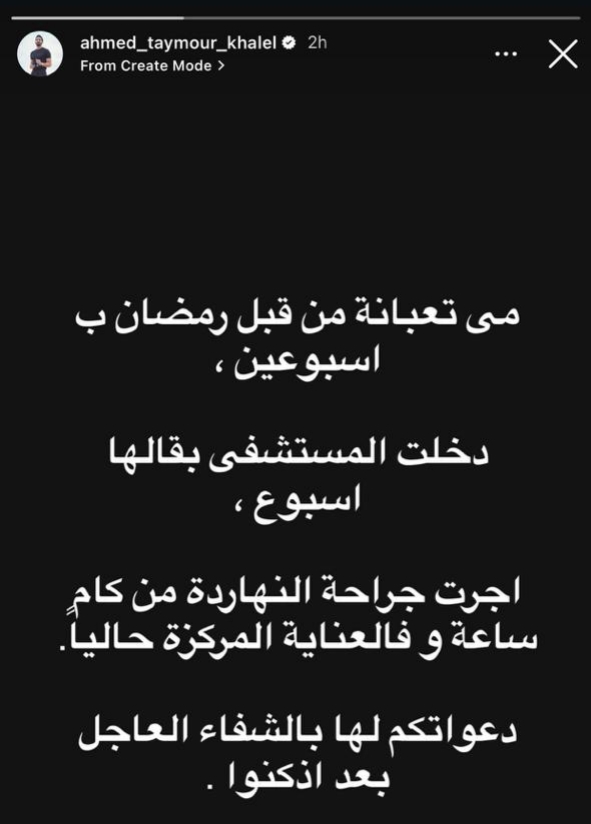 وفي رسالة مؤثرة غلب عليها القلق، طالب أحمد تيمور كل محبي ومعجبي النجمة بالدعاء لها، قائلا: "دعواتكم لها بالشفاء العاجل.. بعد إذنكم".