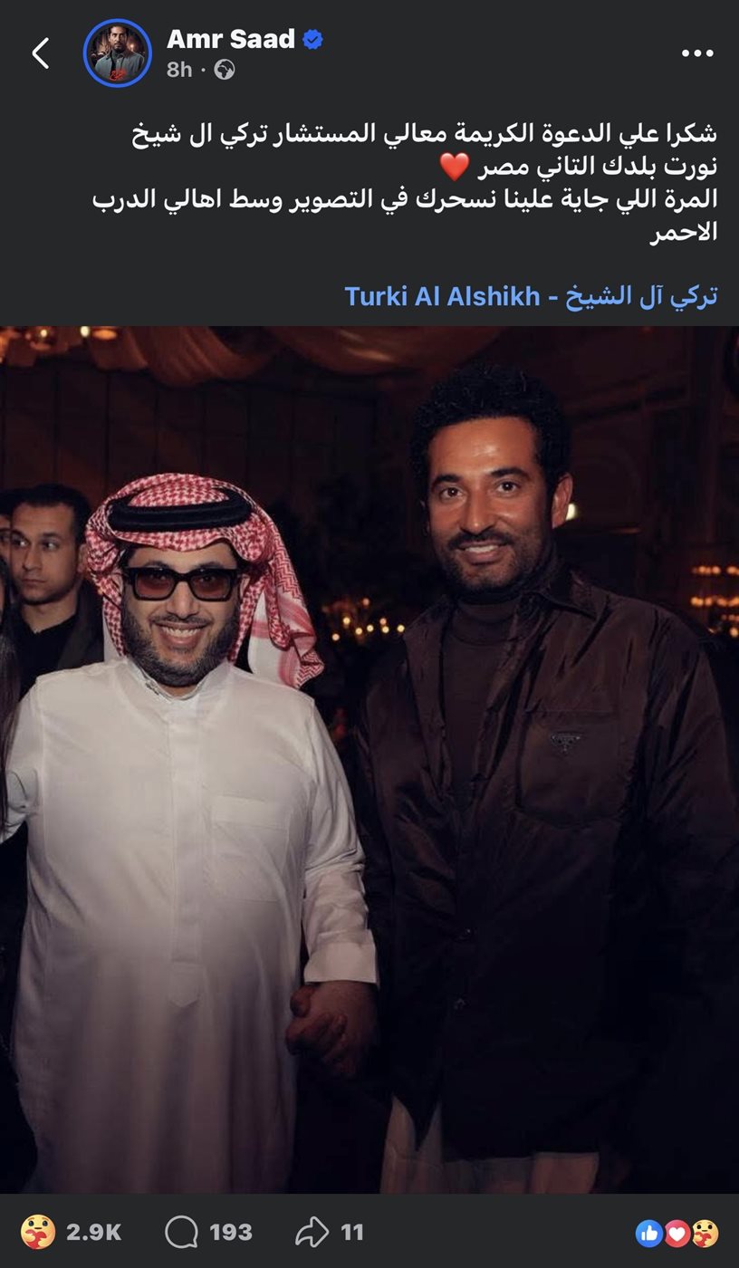 نشر عمرو سعد صورته مع تركي آل الشيخ من سحور أمس وأرفقها بتعليق قائلًا: “شكرًا على الدعوة الكريمة معالي المستشار تركي آل شيخ نورت بلدك التاني مصر”، مضيفًا: “المرة اللي جاية علينا نسحرك في التصوير وسط أهالي الدرب الأحمر”، وذلك خلال منشور عبو حسابه الشخصي بموقع التواصل الاجتماعي الأشهر “فيسبوك”.