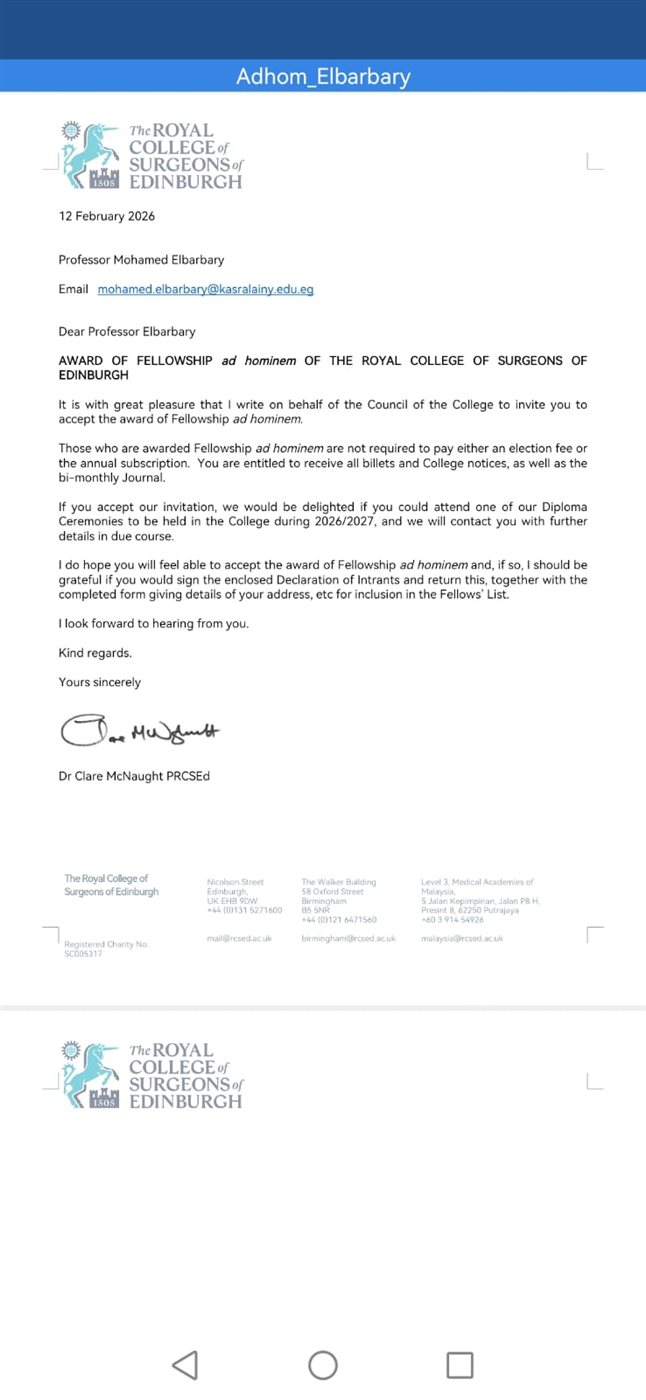 وجاء في الخطاب الرسمي الصادر عن مجلس الكلية الملكية بتاريخ 12 فبراير 2026 دعوة للدكتور محمد البربري لقبول الزمالة الفخرية.