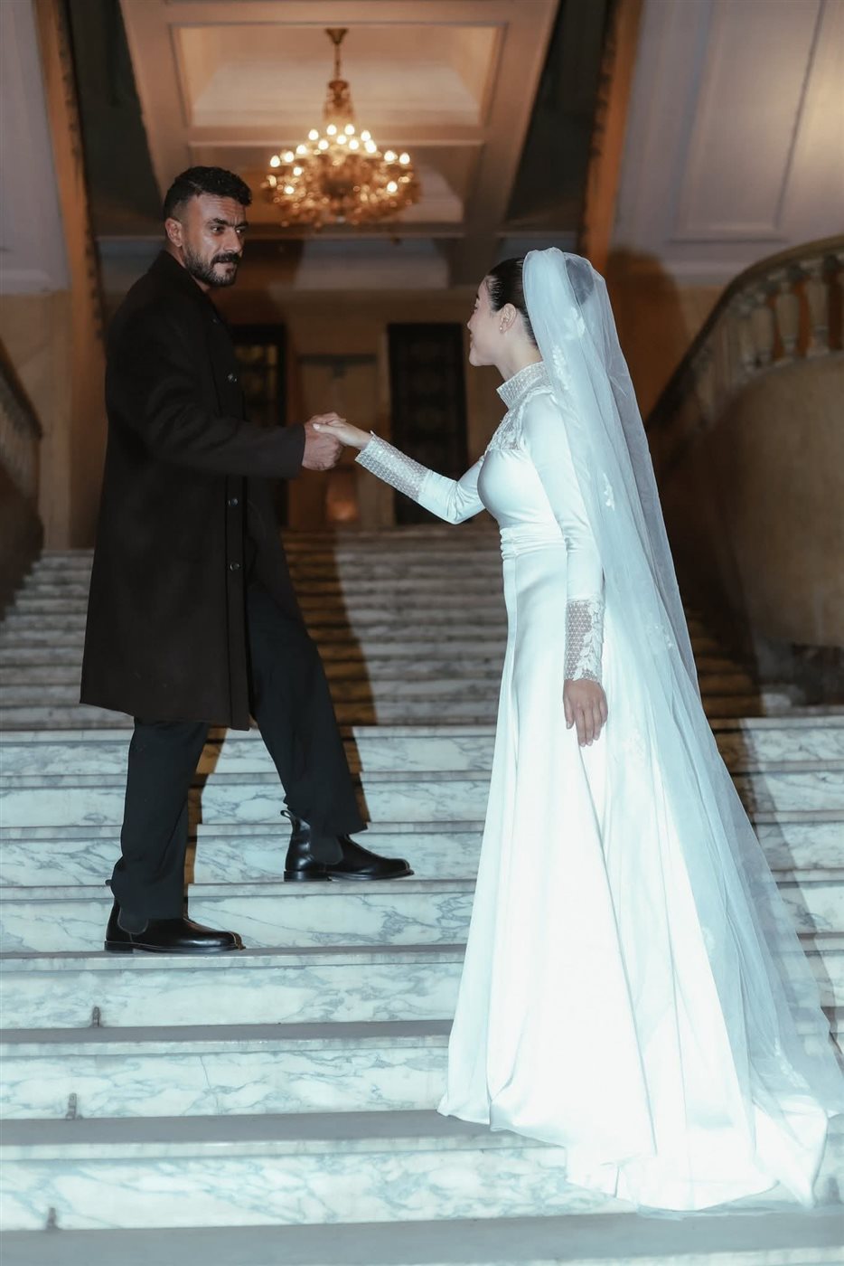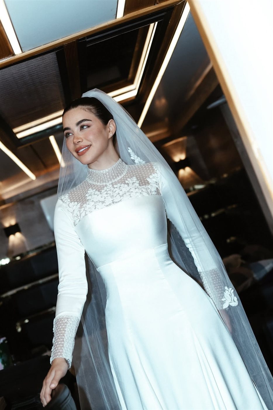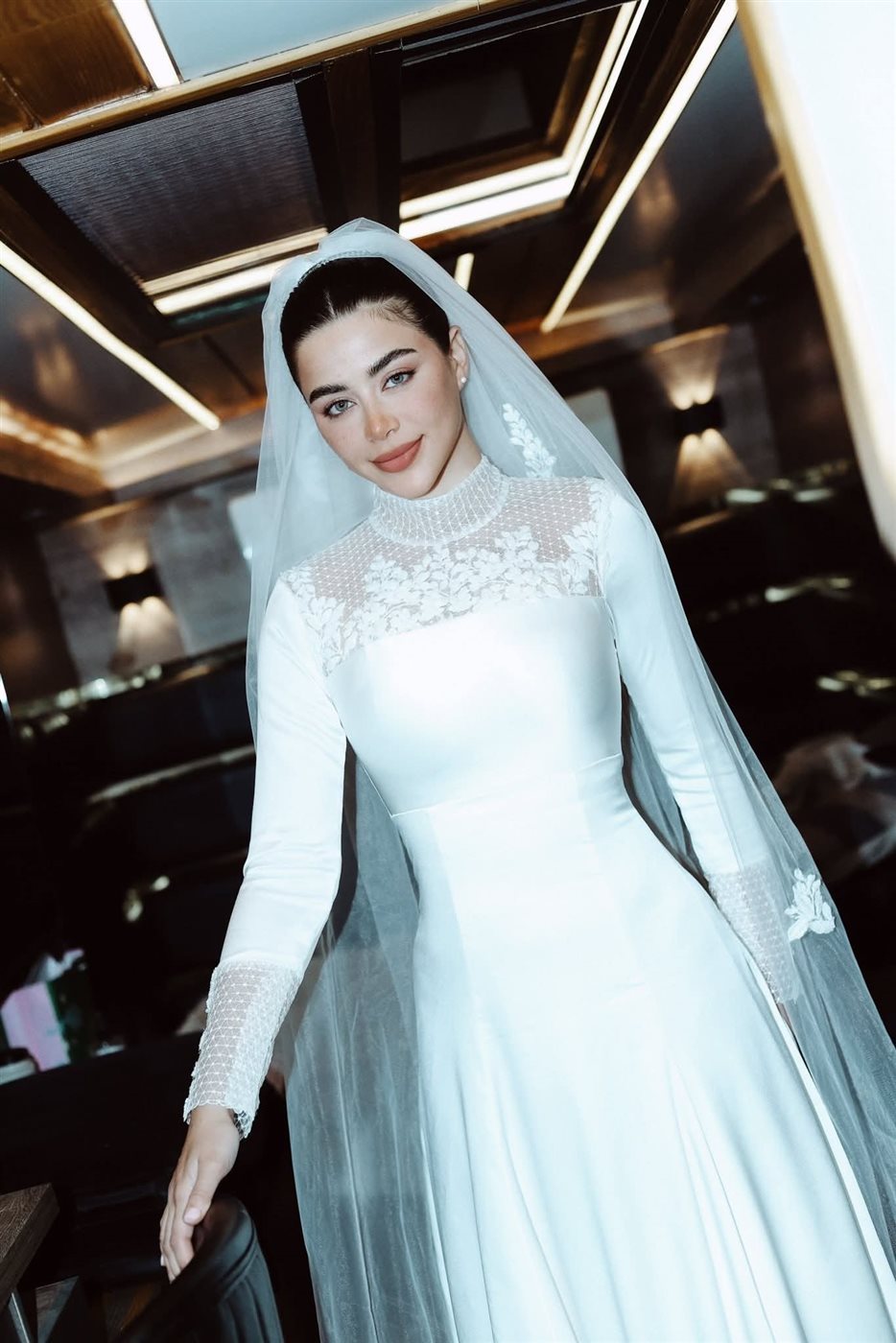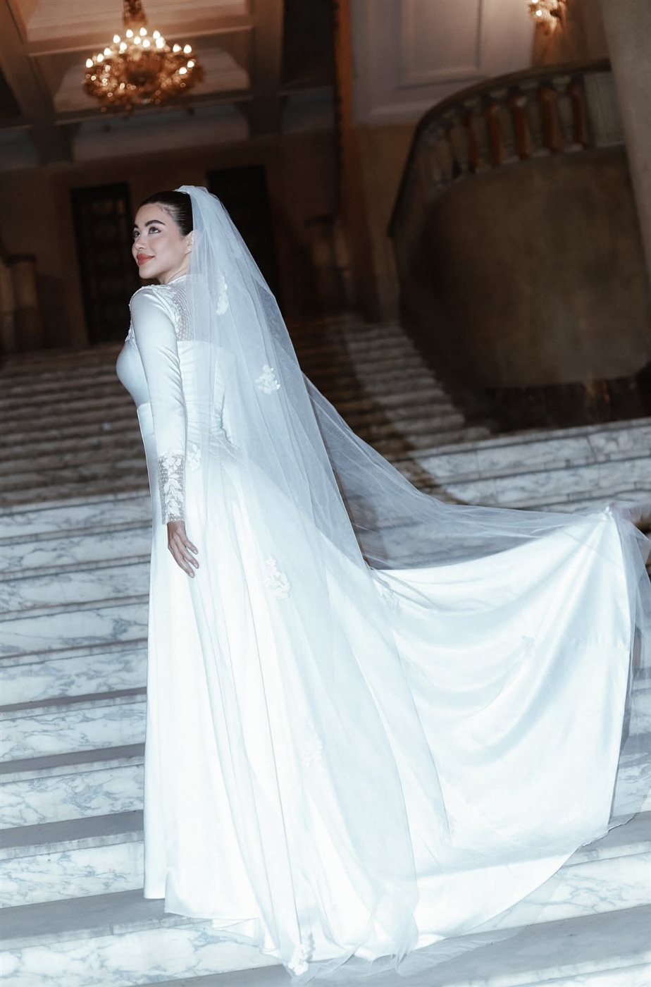 ومن الناحية الجمالية اعتمدت تسريحة شعر جذابة تتناسب مع طرحة الزفاف المصممة كم التل ووضعت مكياجا جذابًا مرتكزا على الألوان الترابية مع تحديد عينيها بالكحل والماسكرا مع لون الكشمير في الشفاه.