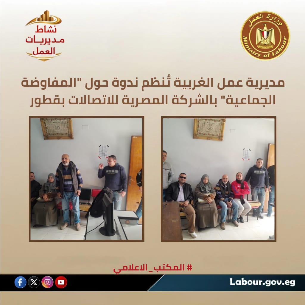 نظم مكتب تفتيش وعلاقات عمل قطور بمحافظة الغربية، ندوة عمالية نوعية بعنوان "المفاوضة الجماعية" بمقر الشركة المصرية للاتصالات، لتعزيز لغة الحوار بين طرفي الإنتاج.