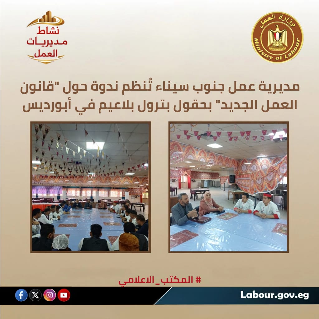 ونظمت مديرية العمل بجنوب سيناء، بإشراف أكرم محمد سيد أحمد، وأحمد مصطفى وكيل المديرية، ندوة توعوية موسعة بشركة "الطلب للتجارة والتوريدات" العاملة بحقول شركة بترول بلاعيم بمدينة أبورديس.