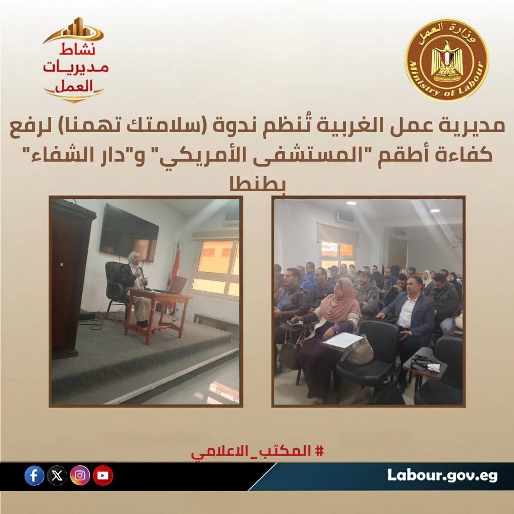 وفي السياق ذاته، نظمت مديرية العمل بالغربية، ندوة توعوية مجمعة بمقر المستشفى الأمريكي بطنطا، استهدفت الكوادر الطبية والإدارية بمستشفيي "الأمريكي" و"دار الشفاء"، لتعزيز معايير السلامة داخل المنشآت الصحية.
